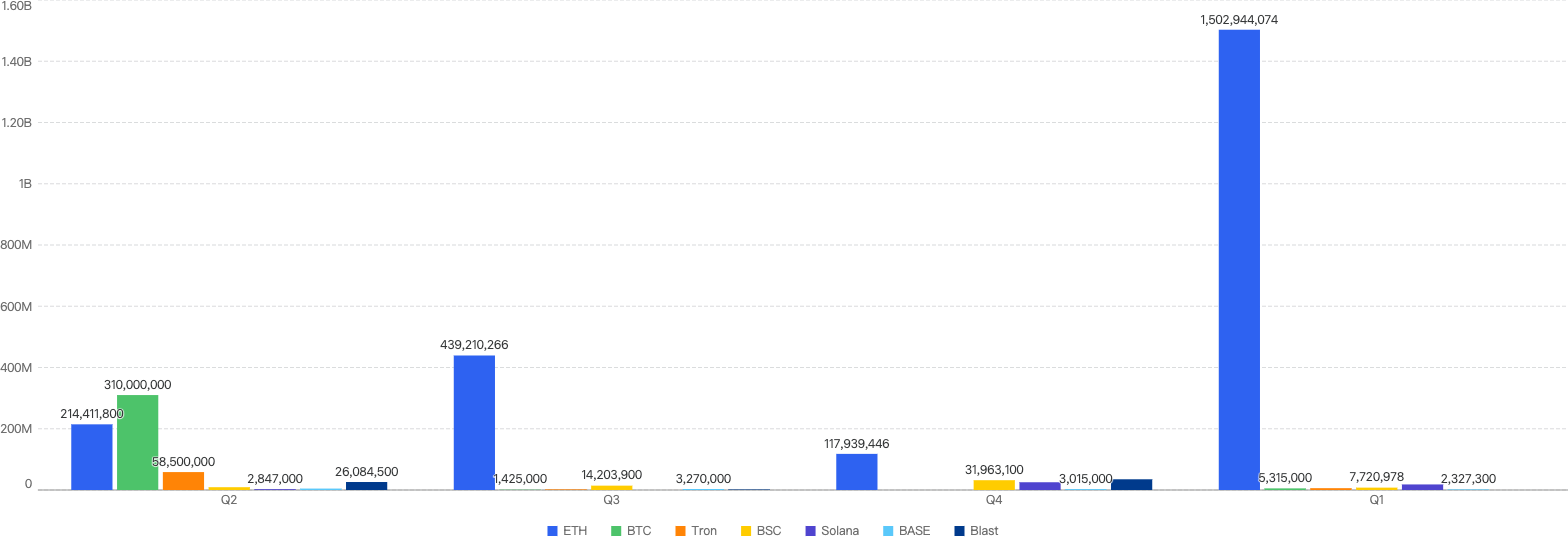 In 2025 Q1, BSC (Binance Smart Chain) accounted for 0.49% of the total fiat losses across all chains, ranking fifth across other chains. Ethereum took first place, representing 95% of the total fiat losses. In terms of incident count, BSC ranked second with 32%, trailing behind Ethereum.